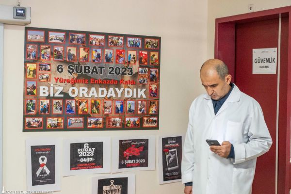 Eşrefpaşa Hastanesi’ndeki anma töreni poliklinik girişinde düzenlendi. Başhekim Yavuz Uçar, Başhekim Yardımcısı Filiz Dağ, Başhekim Yardımcısı Gaffar Karadoğan ve hastane personelinin katıldığı anma töreninde konuşan Başhekim Yardımcısı Gaffar Karadoğan, “Bu acının tek sebebi doğal afet değildi. Bilimden uzak yapılaşma ve bilimden uzak denetim. Vicdansız denetim. Bir daha böyle acılar yaşanmaması için yapılaşmanın ve denetimin bilimsel olması gerektiğini çok iyi biliyoruz. İzmir Büyükşehir Belediyesi Eşrefpaşa Hastanesi olarak bizler her acıda olduğu gibi hem birilerini kurtarabilmek hem de geride kalanların acılarını paylaşabilmek, yardım eli uzatabilmek için Hatay’a, Maraş’a, Adıyaman’a, Osmaniye’ye aynı gün akın ettik. Bir hafta sonra bölgede Eşrefpaşa Sahra Hastanesi’ni kurduk. 8 hafta bölgede yaraları sarmaya çalıştık. Bizler her acıda dayanışmayı, yardımlaşmayı kendimize görev biliriz” dedi.