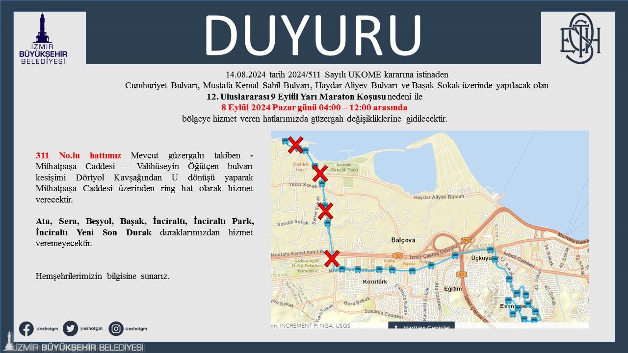 İzmir’in kurtuluşunun 102. yıl dönümü kutlamaları kapsamında, 8 Eylül Pazar günü, 12. Uluslararası 9 Eylül Yarı Maratonu düzenlenecek. Organizasyon nedeniyle 04.00-12.00 saatleri arasında bazı ESHOT hatlarında geçici güzergâh değişiklikleri olacak. Bostanlı – Üçkuyular feribotları 08.30 – 11.00 saat diliminde hizmet veremeyecek. Konak Tramvayı’nda da 06.00 – 11.30 saatleri arasında işletim yapılamayacak.