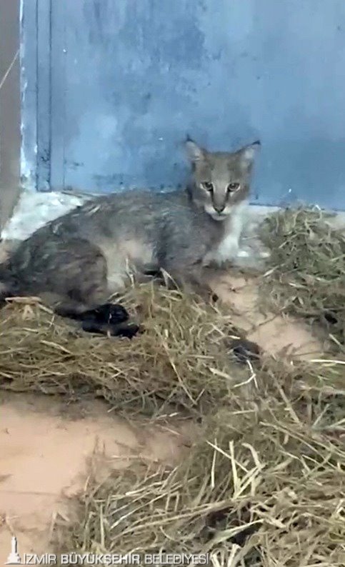 Aydın’da geçen yıl 27 Ağustos’ta Doğa Koruma ve Millî Parklar Genel Müdürlüğü (DKMP) ekipleri tarafından yaralı halde bulunan saz kedisi (Felis chaus), tedavi edilmek üzere İzmir Büyükşehir Belediyesi Veteriner İşleri Dairesi Başkanlığı’na bağlı Doğal Yaşam Parkı Kliniği’ne getirildi. Yapılan klinik ve radyografik değerlendirmelerde hayvanda kalça çıkığı, sağ femurda parçalı açık kırık ve kalça bölgesinde kırıklar tespit edildi. Ayağa kalkamadığı ve arka bacağını sürüyerek ilerlemeye çalıştığı gözlenen saz kedisinin genel durumu, uygulanan yoğun bakım ve destekleyici tedavilerle düzeltildi.