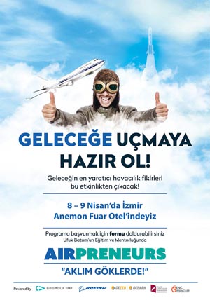 8 Nisan 2017, İZMİR – Havacılık ve uzay sektörünün lideri Boeing, Türkiye Girişimcilik Vakfı ile birlikte üniversite öğrencilerine yeni bir fırsat sunuyor. Gençleri havacılık alanında daha girişimci kılmak ve bu alanda yeni fikirlerin ortaya çıkmasını sağlamak amacıyla geliştirilen ve lansmanı Ankara Bilkent Üniversitesi’nde gerçekleştirilen “Airpreneurs” programının beşinci ayağı Dokuz Eylül Üniversitesi ve Katip Çelebi Üniversitesi ile birlikte İzmir’de gerçekleştirildi.