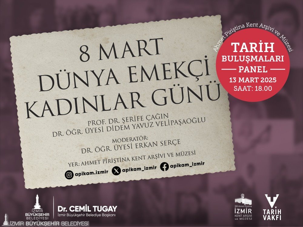 Ahmet Piriştina Kent Arşivi ve Müzesi’ndeki (APİKAM) “Tarih Buluşmaları” bu kez kadın emeğinin farklı yönleriyle ele alınacağı 8 Mart Dünya Emekçi Kadınlar Günü paneliyle devam edecek. 13 Mart Perşembe günü yapılacak panel, Dr. Öğretim Üyesi Erkan Serçe’nin moderatörlüğünde, Prof. Dr. Şerife Çağın ve Dr. Öğretim Üyesi Didem Yavuz Velipaşaoğlu’nun katılımıyla gerçekleşecek.