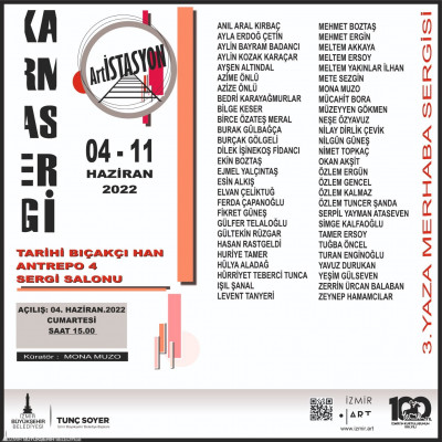 İzmir Büyükşehir Belediyesi’nin ev sahipliğinde 4-11 Haziran tarihleri arasında Art İstasyon Grubu’nun 3. Yaza Merhaba Sergisi düzenleniyor. İzmir Büyükşehir Belediye Başkanı Tunç Soyer tarafından kent yaşamına yeniden kazandırılan Tarihi Bıçakçı Han, küratörlüğünü sanatçı ve İzmir Suluboya Ressamları Derneği Başkanı Mona Muzo’nun yaptığı, çoğu Dokuz Eylül Üniversitesi Buca Eğitim Fakültesi Resim-İş Eğitimi Bölümü akademisyen ve mezunlarından oluşan 54 sanatçının eserlerine ev sahipliği yapacak. Resim, heykel, grafik baskı, suluboya ve seramik disiplinlerinden oluşan karma sergi hafta içi 09.00-17.30 saatleri arasında ziyaret edilebilir.
