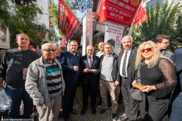 İzmir Büyükşehir Belediye Başkanı Tunç Soyer, Konak’ta Plevne Taksi Durağı çalışanlarının Atatürk’ün ölümünün 85’inci yıldönümü nedeniyle düzenlediği lokma dağıtımına ve Alsancak Hocazade Camii’nde Kültür Mahallesi ile Alsancak Mahallesi Muhtarlığı önderliğinde İzmirli yurttaşların katkısıyla düzenlenen mevlide katıldı. Etkinliğe CHP İzmir Milletvekili Rıfat Nalbantoğlu, İzmir Şoförler ve Otomobilciler Esnaf Odası Başkanı Celil Anık da katıldı. Vatandaşlarla sohbet eden İzmir Büyükşehir Belediye Başkanı Tunç Soyer, “Ben İzmir’de ilk defa bu sene ulu önderimiz Mustafa Kemal Atatürk’ü anma etkinliklerini bu kadar kalabalık gördüm. İnsanlar sel gibi Cumhuriyet Meydanı’na aktı. Vatandaşlar akın akın meydanları doldurdu. Bu umut verici bir şey. Atatürk hala deniz feneri olmaya, bizlere umut vermeye devam ediyor” dedi.