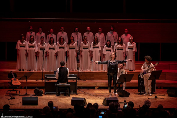 Başkan Soyer Ege’nin iki yakasındaki halkların dostluğuna değinerek, “Bu yıl İzmir’in yani bu memleketin kuruluşunun ve kurtuluşunun simgesi İzmir’in kurtuluşunun 100’üncü yılı. 100’üncü yılın aslında en büyük zaferi barış. Barışı 100 yıldır sürdürüyor olmamız… Barışın en güzel dili de müzik. Çünkü farklı diller konuşsa da insanlar müziğin ortak melodisi eğer aynı bam telini titretiyorsa yüreklerde o iki yakanın insanları arasında çok ortak payda var demektir. Bu akşam dinleyeceğimiz Ruhi Su Korosu ve Alexandra Gravas aslında bize bunu bir kere daha hatırlatacak. Emin olun ki her iki yakanın insanlarında da aynı bam telini titretecek müzikler dinleyeceğiz. Dilerim bu bize aynı zamanda ne kadar çok ortak paydamız olduğunu bir kez daha hatırlatır” ifadelerini kullandı.