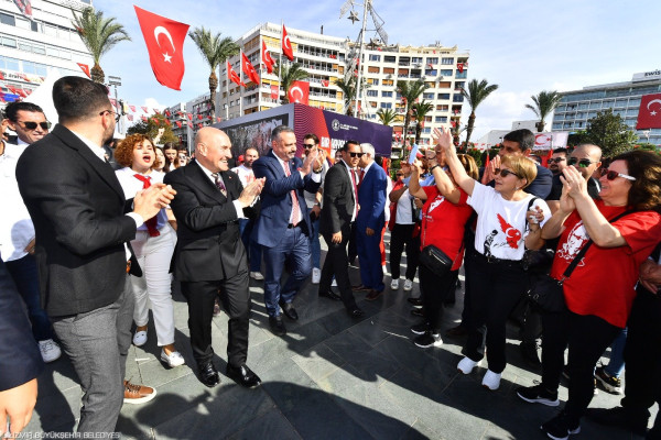 CHP İzmir İl Başkanı Şenol Aslanoğlu ise, “Bugün hepimiz için en kutlu gün. Çünkü bugün tebaa olmaktan, kul olmaktan çıkıp, vatandaş olmaya geçtiğimiz gündür. Egemenliğin bizde, bizzat millette olduğunun anayasamıza yazıldığı gündür. Yüz yıl sonra aynı coşkuyla haykırıyoruz. Yaşasın Cumhuriyet. Bölgemizdeki istikrarsızlıkların içerisinde bugün özgürce yaşayabiliyorsak, her şeye rağmen demokrasimizle gurur duyabiliyorsak, bunu sağlayan Cumhuriyet’tir. Bunu bize sağlayan “Yurtta Sulh, Cihanda Sulh” diyen Atatürk’tür. Savaşın ne olduğunu Filistinlilere sormak lazım. Iraklılara sormak lazım, Suriyelilere sormak lazım. İranlılara sormak lazım. Azerbaycanlılara sormak lazım. Rusyalılara, Ukraynalılara sormak lazım. Herkesin birbiri ile savaştığı bu coğrafyada 100 yıldır savaş görmeden yaşadığımız için sana minnet duyuyoruz Atam” diye konuştu.