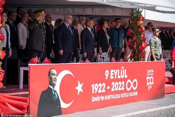 İzmir’in kurtuluşunun 100’üncü yıl kutlamaları büyük coşkuyla devam ediyor. Cumhuriyet Meydanı’nda düzenlenen törene katılan İzmir Büyükşehir Belediye Başkanı Tunç Soyer, “Her bir hücremize kadar İzmirli olmanın onurunu yaşadığımız 9 Eylül tarihi sadece bir şehrin kurtuluşu değildir. Aynı zamanda işgal edilmiş, kuşatılmış bir ülkenin hürriyetine ve bağımsızlığına kavuştuğu günün tarihidir. Bir milletin ayağa kalkışı ve Cumhuriyetimizin doğuşu, 100 yıl önce bugün gerçekleşti. Bu nedenle hep ‘İzmir, umudun yüzüdür’ diyorum” diye konuştu.