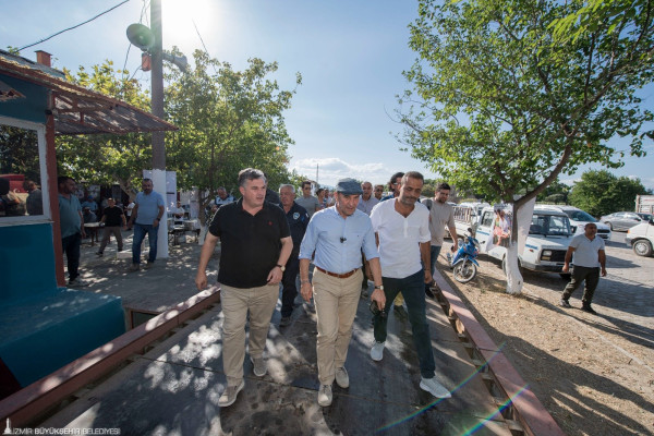 Yayakent’te tarlaya girerek işçilere köy ayranı ikramında bulunan, çiftçilerle bir araya gelerek sohbet eden Başkan Soyer’e İzmir Köy Koop Birlik Başkanı Neptün Soyer, İzmir Büyükşehir Belediyesi Tarımsal Hizmetler Dairesi Başkanı Şevket Meriç, İZDOĞA A.Ş. Yönetim Kurulu Başkanı Güven Eken, İzTarım A.Ş. Genel Müdürü Murat Onkardeşler, İzmir Büyükşehir Belediyesi Sebze Halleri Şube Müdürü Sinan Aslan, Kınık Belediye Başkanı Sadık Doğruer, Dikili Belediye Başkanı Adil Kırgöz, kooperatiflerin temsilcileri ve vatandaşlar eşlik etti.
