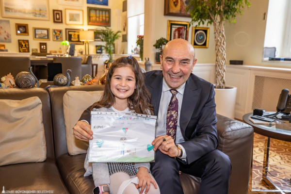 Başkan Soyer’in ikinci konuğu 8 yaşındaki Esila Dora Badak’tı. Esila, Başkan Soyer’in hayvan sevgisini bildiğini ifade ederek “Size hayvan sevgisi konulu bir resim çizmek istedim. Çevreye duyarlılığınız ve hayvanlara verdiğiniz değer benim için çok kıymeti. Sizi çok seviyorum” dedi.