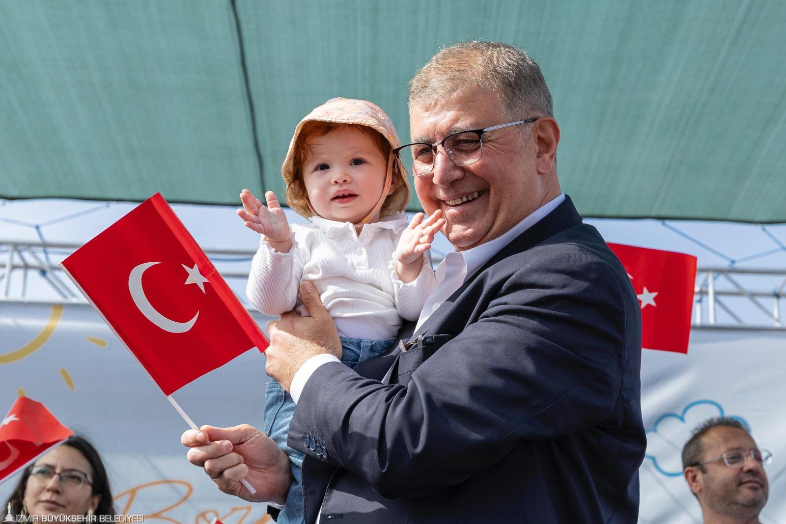 23 Nisan Ulusal Egemenlik ve Çocuk Bayramı’nı kutlayan Başkan Tugay, “Sevgili çocuklar ve sevgili aileleri; bu özel günde sizlerle olmanın büyük mutluluğu içinde hepinizin bayramını yürekten kutluyorum. Bugün sabahtan bu yana İzmir’in farklı yerlerinde çocuklarımızla birlikte olmaya çalıştım. Binlerce çocuğumuzla sarıldık. Burada olduğu gibi hepsi göğüslerinde Türk bayrağı, Atatürk resimleri ile birlikte bizlere aslında bir mesaj veriyorlar. Bu mesajı özellikle büyüklerin, şu anda üzerinde sorumluluk olan herkesin alması gerektiğini düşünüyorum. Çocuklarımız ve gençlerimiz diyorlar ki ‘Biz büyük ve asil bir milletin çocuklarıyız, evlatlarıyız. Bu ülkeye başını önüne eğmek, birilerine teslim olmak yakışmaz. Bize büyük, güçlü, refah bir ülkede adalet içinde özgürlüğümüzü yaşayarak, doyasıya çalışarak dünyanın en büyük ülkelerinden birinin vatandaşı olmak yaraşır.’ Bunun için, çocuklarımız için çalışır mıyız? Bu mesajı almamız gereken bir gündeyiz” ifadelerini kullandı. Başkan Tugay, “Bugün güzel bir gün, bugün bayram, bugün çocuklarımız eğlensin, biz de onların mutluluğunu paylaşalım. Yürek yüreğe olalım. Hepinizi çok seviyoruz, bayramınız kutlu olsun” diyerek sözlerini tamamladı.