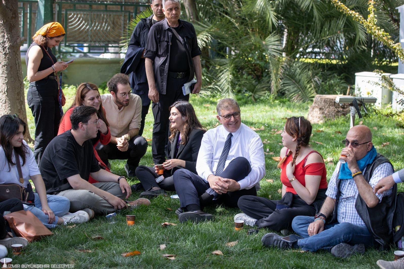 İzmir Büyükşehir Belediye Başkanı Dr. Cemil Tugay, demokratik hak arayışları sırasında tutuklanan arkadaşları için dayanışma çağrısında bulunan gençlerin davetiyle Kültürpark’ın çimleri üzerinde uzun bir sohbet gerçekleştirdi. Başkan Tugay, “Bu ülke güzel yarınlara okuyan, düşünen ve düşüncelerini korkusuzca ifade eden gençlerimiz sayesinde erişecek” dedi.