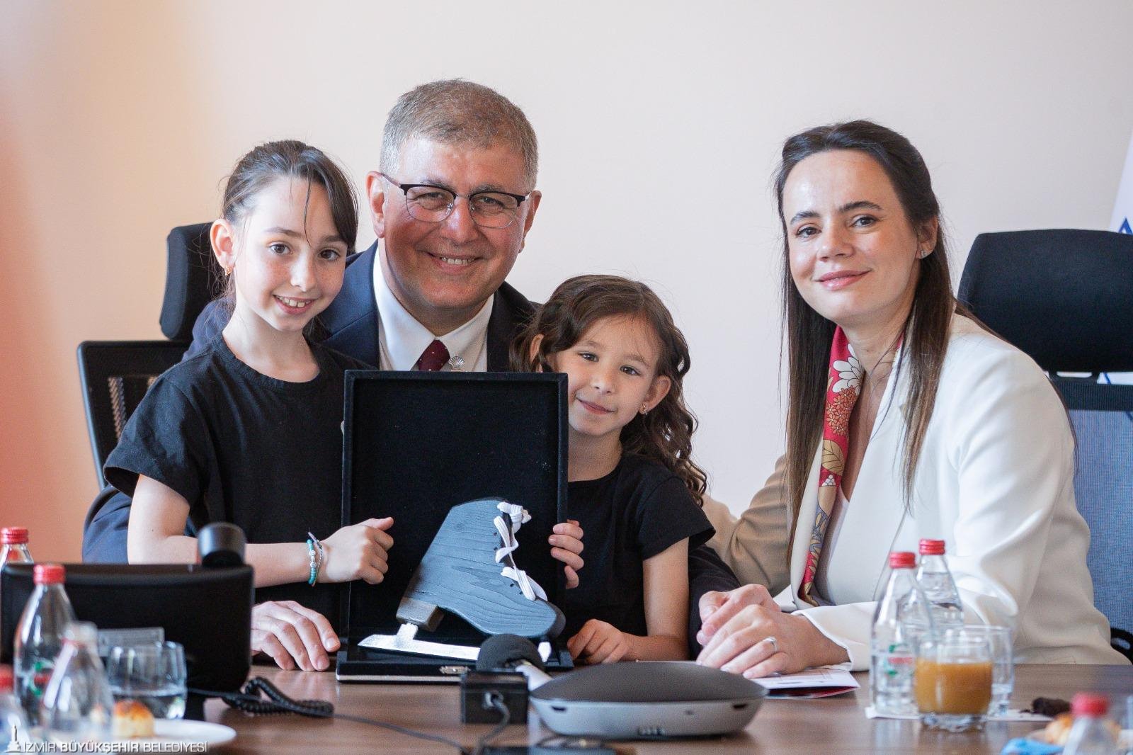 Sporcu çocuklar, Başkan Tugay’a buz pateni şeklinde bir plaket takdim etti. Tugay, “Son yıllarda aldığım en güzel hediye, hediyeyi verenler çok tatlılar” diyerek teşekkür etti.