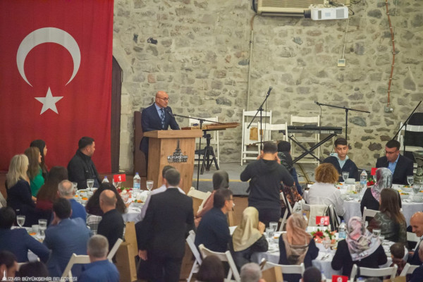 İzmir Büyükşehir Belediye Başkanı Tunç Soyer, 1-7 Ekim tarihlerinde kutlanan “Camiler ve Din Görevlileri Haftası”nın ardından belediye bünyesindeki din görevlileri ve eşleriyle bir araya geldi. Tarihi Havagazı Fabrikası’nda düzenlenen geceye İzmir Büyükşehir Belediye Başkanı Tunç Soyer’in eşi Neptün Soyer, İzmir Büyükşehir Belediyesi Genel Sekreter Yardımcısı Şükran Nurlu, Mezarlıklar Dairesi Başkanı Hülya Şahin, din görevlileri ve aileleri katıldı. Gecenin açılışında konuşan Başkan Soyer, “Sizlerle bereket sofrasında buluşmanın mutluluğunu yaşıyorum. Dinimiz İslam, tüm insanlığa kucak açmış bir hoşgörü ve sevgi deryasıdır. Ne mutlu ki milletimiz asırlardır bu deryanın eşsiz bir parçasıdır” dedi.