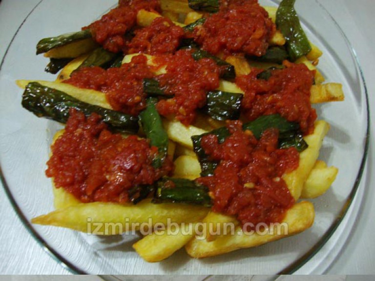 3- Tavanın içine yağ koyularak biber ve patatesler yağda kızartılarak servis tabağına aktarılır.
