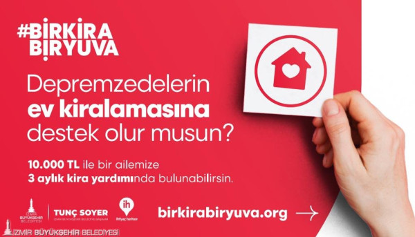 11 ilde büyük yıkıma neden olan deprem felaketi sonrasında barınma sorununa çözüm bulmak için İhtiyaç Haritası ile “Bir Kira Bir Yuva” kampanyasını başlatan İzmir Büyükşehir Belediyesi, dayanışmayı büyütüyor. Kira yardımı yapmak veya boş durumdaki evini depremzedelere açmak isteyenleri, barınacak eve ihtiyacı olanları birkirabiryuva.org sitesi üzerihden buluşturan kampanya için bu kez ekran başından Türkiye’ye ve dünyaya çağrıda bulunulacak.