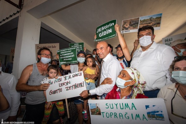 “Susma haykır, JES’e hayır”, “Üzüm, incir, zeytin geleceğimiz”, “Burası jeotermal arsası değil, keçilerin merası”, “Zeytinime dokunma” yazılı dövizlerin taşındığı protestoda Başkan Tunç Soyer, yerel yöneticilerin asli işinin, görev yaptıkları toprakları ve onun kültürünü korumak olduğunu belirtti. Soyer, “İlk işimiz, bu toprakları korumaktır. Çünkü bizim üstlendiğimiz görevler, nöbet görevleridir. Biz nöbetçiyiz. Biz görev süremizin sonunda gideceğiz ama görev süresi içerisinde bize emanet edilen, atalarımızın binlerce yıl boyunca biriktirdikleri değerleri, korumazsak hangi görevi yapmış oluruz? Hangi işi yapmış oluruz? Aslolan, bizden önce de var olup, atalarımızın bize devrettiği bu mirası canla başla korumaya çalışmak. Çünkü bunu yok etmek için, bunun üzerinden kar etmek için, bu toprakları ranta kurban etmek için ellerinden geleni yapıyorlar. Yapmaya da devam edecekler. Onun için varız” dedi.