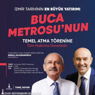 İzmir Büyükşehir Belediyesi kent tarihinin en büyük yatırımı Buca Metrosu’nun temelini yarın dev bir organizasyonla atıyor. Törene Cumhuriyet Halk Partisi Genel Başkanı (CHP) Kemal Kılıçdaroğlu da katılacak. İzmir Büyükşehir Belediye Başkanı Tunç Soyer, İzmir halkına seslenerek “Güzel İzmir’imize sevgimizi göstereceğimiz, coşkumuzu ve gururumuzu paylaşacağımız, birlikte şarkılar söyleyeceğimiz törenimize hepinizi bekliyoruz” dedi.