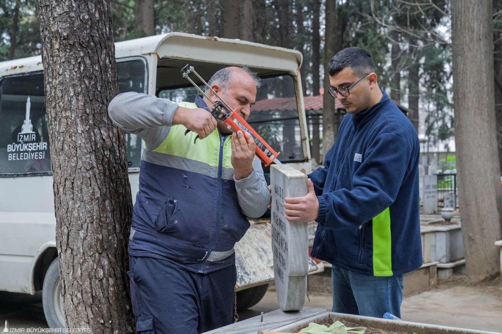 Mezarlıklar Dairesi Başkanlığı ekipleri, saldırı sonrası zarar gören mezarların teker teker tespitini yaptı. Ekipler, sökülmüş fakat parçalanmamış mezar taşlarını onararak eski yerlerine yerleştirdi. Parçalanan mezar taşları ise birleştirilerek fotoğraflandı. Fotoğraflanan mezar taşları, İzmir Büyükşehir Belediyesi’nin atölyelerinde aynı yazı ve mermer kalitesinde üretilerek yerine konulacak. Mezarların kırılan diğer mermer aksamlarının ise uygun ölçüler alınarak yerinde tamiri yapılmaya başlandı.
