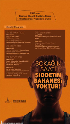 İzmir Büyükşehir Belediyesi “Şiddetsiz Bir Dünya Birlikte Mümkün” sloganıyla 25 Kasım Kadına Yönelik Şiddete Karşı Uluslararası Mücadele Günü kapsamında 21-25 Kasım tarihlerinde beş günlük bir program hazırladı. Sinemadan tiyatroya, canlı performanstan bisiklet turuna kadar birçok etkinlik yapılacak.