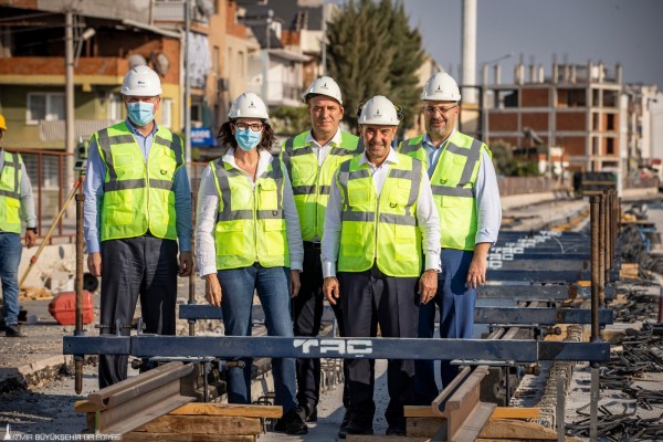 İzmir Büyükşehir Belediye Başkanı Tunç Soyer Çiğli Tramvayı inşaatındaki çalışmaları inceledi. Evka-5 kavşağında süren imalatlar ile ilgili İzmir Büyükşehir Belediyesi Raylı Sistem Dairesi Başkanı Mehmet Ergenekon’dan bilgi alan Başkan Tunç Soyer, bölgedeki çalışmalar kapsamında tramvayın ilk raylarının döşendiğini müjdeledi. “İzmir’i demir ağlarla örüyoruz” vizyonuyla yola çıktıklarını belirten Soyer, “Bugün o demir rayları montajı başlamış olarak görmek, yüreğimize su serpiyor. Pandemiye rağmen, sıcak havaya rağmen arkadaşlarım hiç aksatmadan çalışmalarını sürdürüyor. Bundan büyük gurur duyuyorum” dedi.