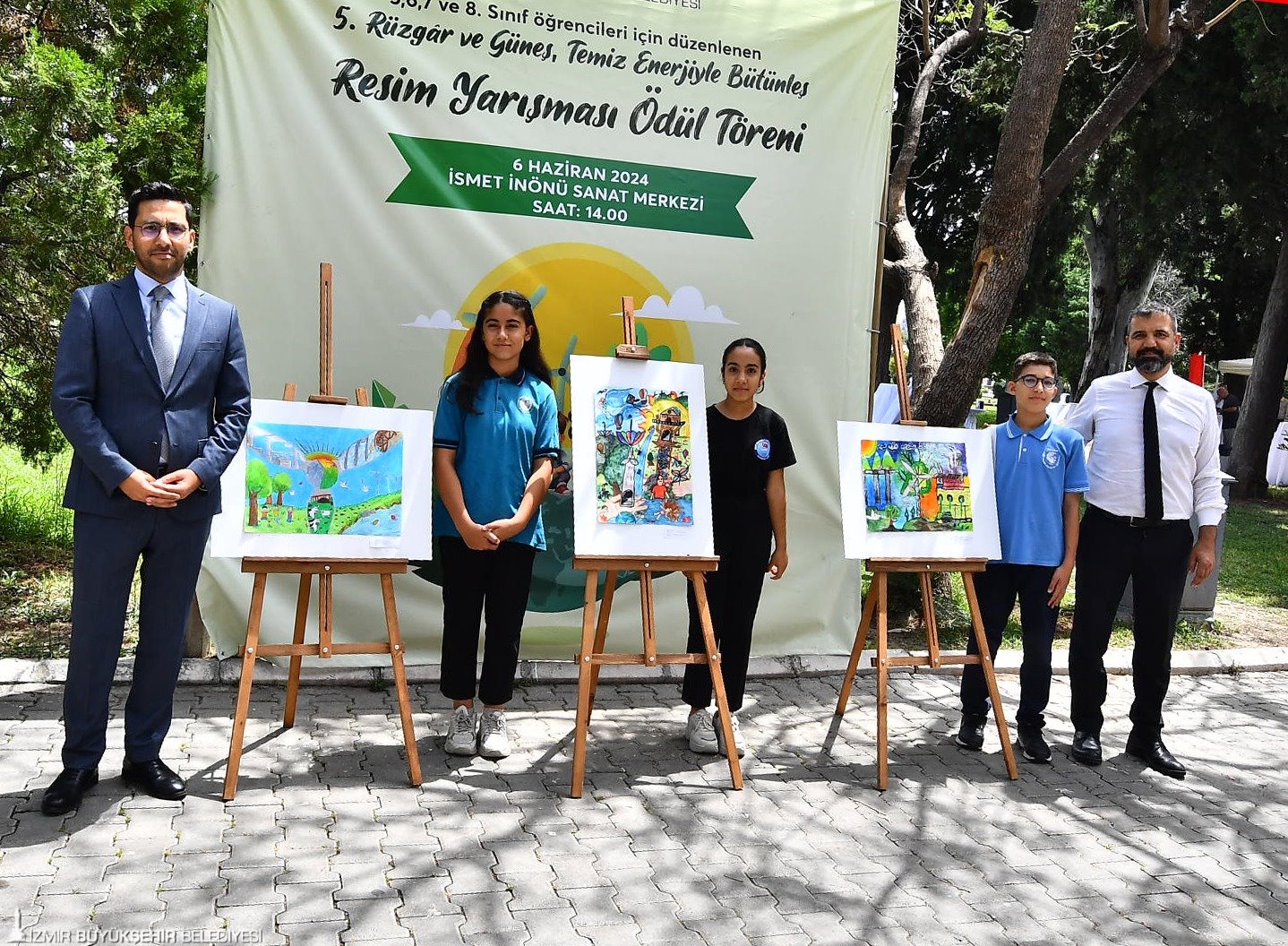 İzmir Büyükşehir Belediyesi’nin 5 Haziran Dünya Çevre Günü etkinlikleri kapsamında bu yıl 5’incisini düzenlediği “Rüzgâr ve Güneş Temiz Enerji ile Bütünleş” konulu resim yarışmasının ödül töreni İsmet İnönü Kültür Merkezi’nde yapıldı. 29 okuldan 122 eserin katıldığı yarışmada ilk üçe giren Gazi Umurbey Ortaokulu 6. sınıf öğrencisi Elif Su Şengül, 80. Yıl Asarlık Ortaokulu 6. sınıf öğrencisi Kübra Küpeli ve Başöğretmen Ortaokulu 7. sınıf öğrencisi Doruk Cem Çeler’e ödülleri verildi.