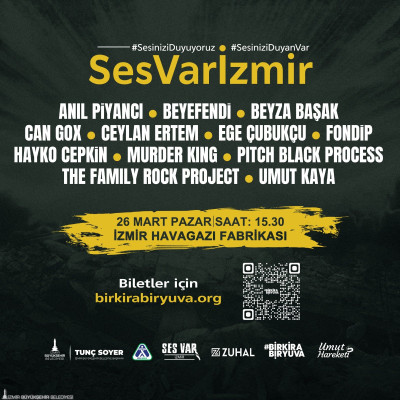 İzmir Büyükşehir Belediyesi, Türkiye’de 11 ili etkileyen depremlerin yaralarını sarmak amacıyla birçok sanatçıyı aynı anda İzmir’de “Ses Var İzmir” dayanışma konserinde buluşturacak. Tarihi Havagazı Fabrikası’nda 26 Mart Pazar günü saat 15.30’da yapılacak konser kapsamında Anıl Piyancı, Beyefendi, Beyza Başak, Can Gox, Ceylan Ertem, Ege Çubukçu, Fondip, Hayko Cepkin, Murder King, Pitch Black Process, The Family Rock Project ve Umut Kaya sahne alacak. Konserin geliri İzmir Büyükşehir Belediyesi’nin depremlerin ardından sığınacak eve ihtiyaç duyan aileler için başlattığı Bir Kira Bir Yuva kampanyasına aktarılacak.