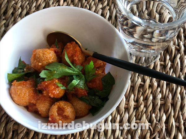 Yukarıda saydığımız malzemeler güzelce yoğrularak ceviz büyüklüğünde yuvarlanır, kaynayan sıcak suda haşlanır. Üzerine domates ve zeytinyağı, isteğe göre sarımsak konur. En son üzerine taze maydanoz doğranır.
