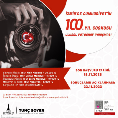 İzmir Büyükşehir Belediyesi, Cumhuriyet’in 100’üncü yıl coşkusunu İzmir’de düzenlenecek etkinliklerle belgelemek isteyen fotoğrafçılar için ulusal fotoğraf yarışması düzenliyor. Cumhuriyet tarihinin bu anlamlı gününde yapılacak etkinliklere arşiv olacak nitelikteki yarışmada 23 Ekim – 9 Kasım 2023 tarihleri arasında İzmir’deki kutlamalar sırasında çekilen fotoğraflar değerlendirilecek. Son katılım tarihinin 15 Kasım olduğu yarışmada birincilik ödülü 20 bin lira olacak.