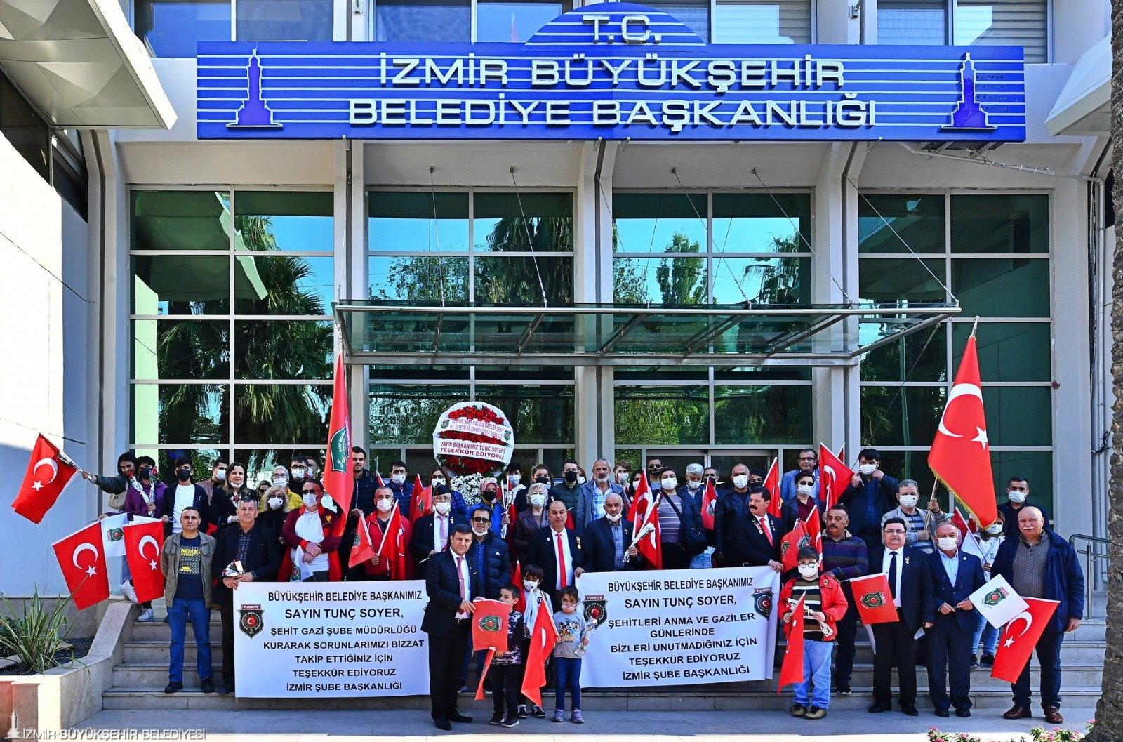 Türkiye Harp Malulü Gaziler, Şehit Dul ve Yetimleri Derneği İzmir Şubesi, yerel yönetimlerin yetki alanındaki sorunlarının hızla çözülmesi için Sosyal Hizmetler Dairesi Başkanlığı bünyesinde Şehit Aileleri ve Gaziler Şube Müdürlüğü’nü kuran İzmir Büyükşehir Belediye Başkanı Tunç Soyer’e basın açıklamasıyla teşekkür etti. Gaziler ve şehit yakınları ellerinde taşıdıkları teşekkür pankartlarıyla Kültürpark’taki İzmir Büyükşehir Belediyesi Hizmet Binası’nın önüne çelenk ve çiçek bıraktı.