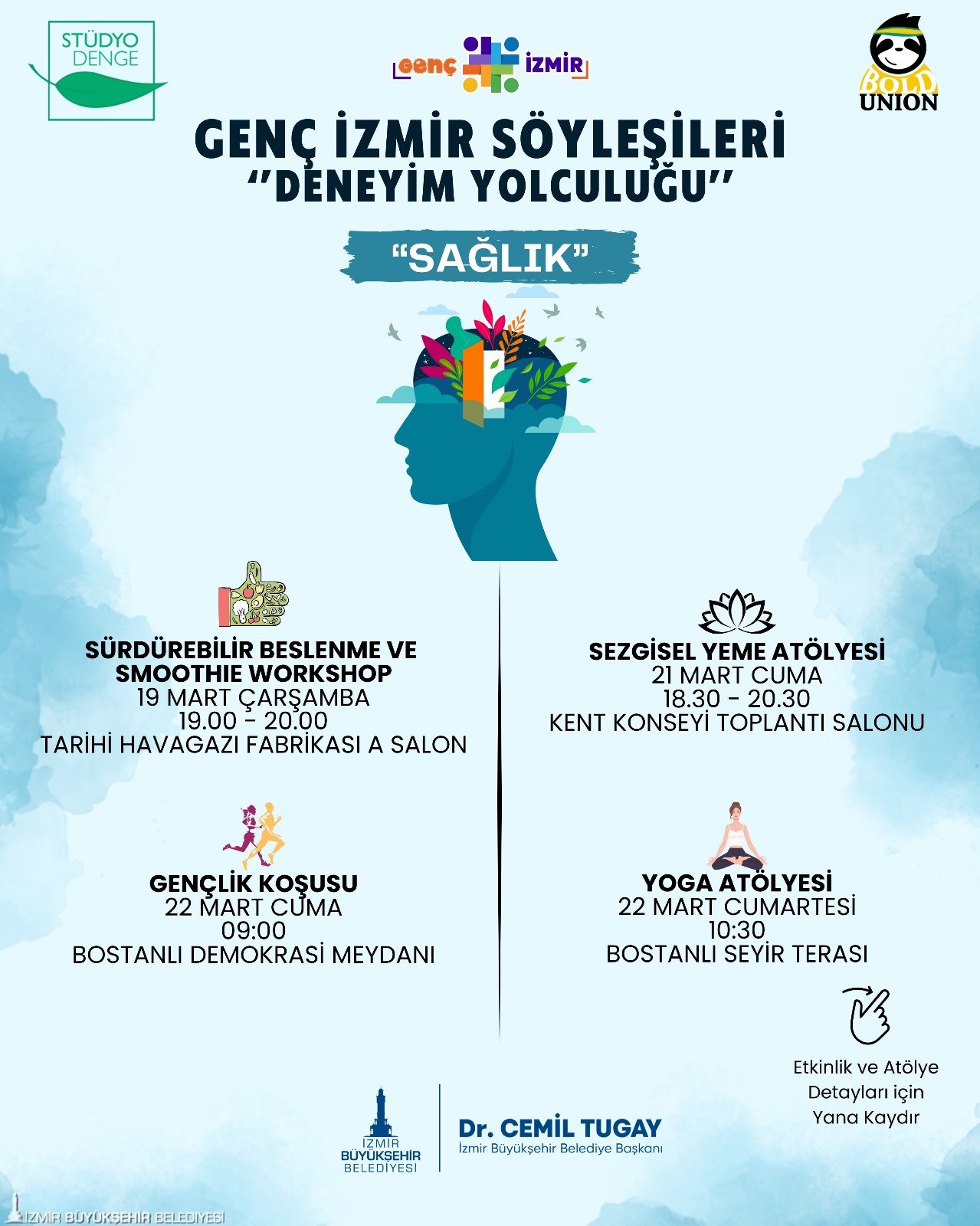 İzmir Büyükşehir Belediyesi tarafından düzenlenen Genç İzmir Söyleşileri Deneyim Yolculuğu programı, mart ayında “Sağlık” temasıyla devam ediyor. 19-21 ve 22 Mart tarihlerinde gerçekleştirilecek etkinliklerde workshoplar, atölyeler ve Gençlik Koşusu yer alacak.