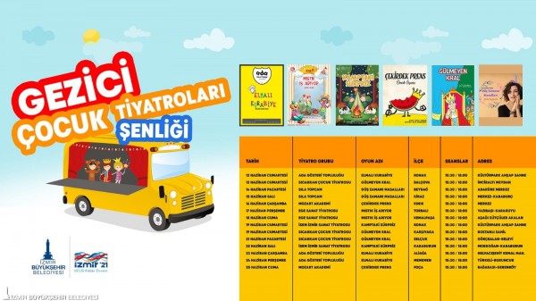 İzmir Büyükşehir Belediyesi çocukları on üç ilçede ücretsiz tiyatro oyunlarıyla buluşturacak. Gezici Çocuk Tiyatroları Şenliği 12 Haziran’dan 25 Haziran’a kadar devam edecek. Her oyun alanında palyaço ve yüz boyama etkinliğe de yapılacak. Konak, Balçova, Beydağ, Kiraz, Kınık, Torbalı, Kemalpaşa, Karşıyaka, Selçuk, Karaburun, Aliağa, Menemen, Foça’yı ziyaret edecek Gezici Sanat Kamyonu’nda “Elmalı Kurabiye”, “Mıstık İş Arıyor”, “Gülmeyen Kral”, “Çekirdek Prens”, “Düş Zamanı Masalları” ve “Kamptaki Sürpriz” adlı oyunlar 15.30 ve 18.00 saatleri arasında sahnelenecek.