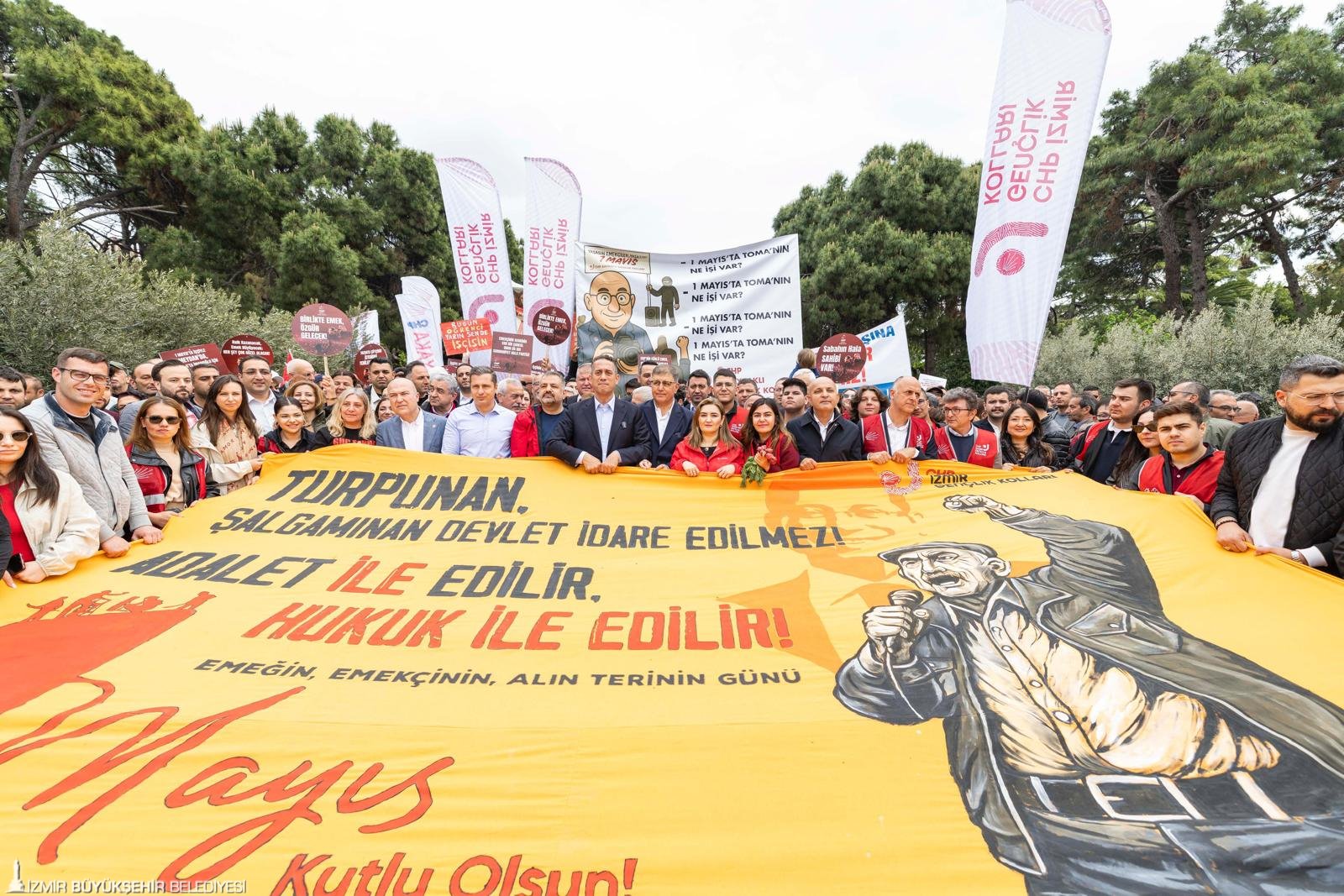 İzmir Büyükşehir Belediye Başkanı Dr. Cemil Tugay, daha sonra Kıbrıs Şehitleri Caddesi’nden Lozan Meydanı’na kadar yürüdü. Esnafın ve işçilerin bayramını kutlayan Tugay, CHP İzmir İl Örgütü’nün Lozan Meydanı’ndaki kortejine katıldı. CHP Grup Başkan Vekili Ali Mahir Başarır, CHP Genel Başkan Yardımcısı ve İzmir Milletvekili Murat Bakan, CHP Parti Sözcüsü ve İzmir Milletvekili Deniz Yücel, CHP İzmir İl Başkanı Şenol Aslanoğlu ile CHP İzmir milletvekilleri ve belediye başkanlarının yanı sıra çok sayıda partili yer aldı. Kortej, Cumhuriyet Meydanı’na kadar “Hak, hukuk, adalet” sloganları ile yürüdü.