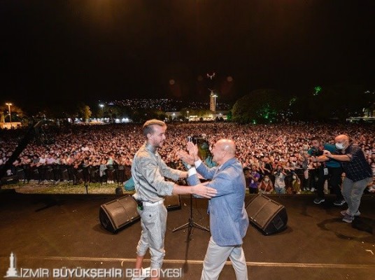 Konserde konuşan Cem Adrian “İzmir’i çok seviyorum. Bizi buraya davet eden herkese çok teşekkürler. Bu gece çok özel bir misafir beni dinlemeye geldi. Sahnemde Tunç Başkan’ı görmek o kadar harika ki… Kendisini çok seviyorum. İzmir’in değerli başkanı ve güzel İzmirlilerle birlikte muhteşem bir geceye imza atacağız” dedi. İzmir Büyükşehir Belediye Başkanı Tunç Soyer ise “Ben de kendisini çok seviyorum. O bir dünya yıldızı, eşsiz bir insan. Fakat en başta çok güzel bir insan. Siz de bu akşam çok güzel görünüyorsunuz. Fuar bu gece bir yıldız gibi parlıyor” şeklinde konuştu.
