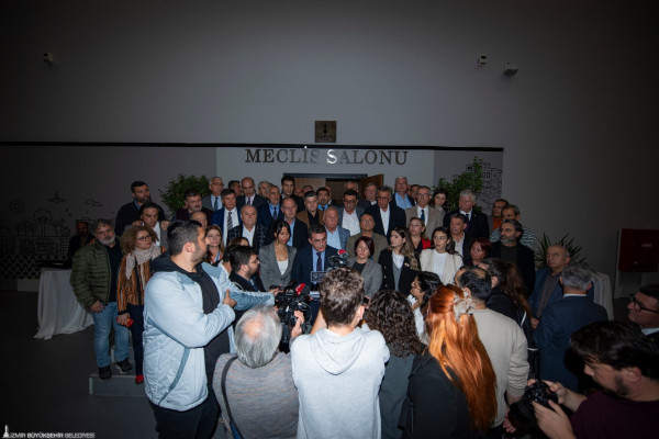 İzmir Büyükşehir Belediye Başkanı Tunç Soyer’e 9 Eylül İzmir’in kurtuluşunun 100’üncü yılı kutlamalarındaki konuşmasından dolayı İçişleri Bakanlığı tarafından açılan soruşturma sonrasında Cumhuriyet Halk Partisi’nden (CHP) tepkiler gelmeye devam ediyor. İzmir Büyükşehir Belediyesi CHP Meclis Grubu da, Kasım ayı meclis toplantısının beşinci birleşimi öncesinde meclis salonu önünde Başkan Soyer’e destek açıklaması yaptı.