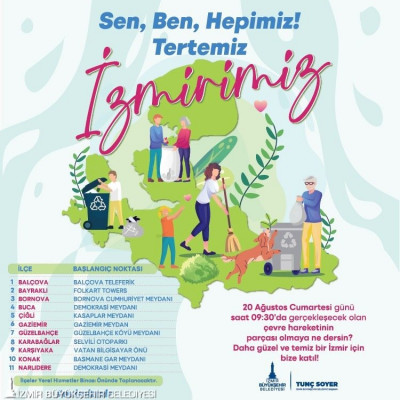 İzmir Büyükşehir Belediyesi kentte çevre bilincini artırmaya yönelik farkındalık projelerini sürdürüyor. Başkan Tunç Soyer, bu kez “Sen, Ben, Hepimiz! Tertemiz İzmirimiz” diyerek İzmirlileri 20 Ağustos 2022 Cumartesi 09.30’da 30 ilçede eşzamanlı temizlik hareketine çağırıyor.