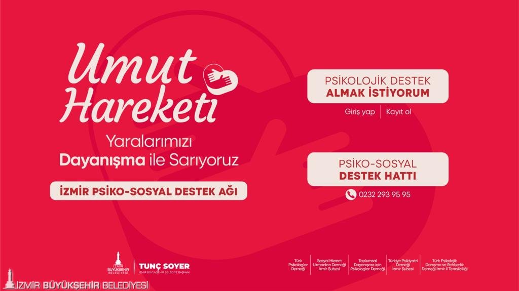 Psikososyal Destek Çalışma Ekipleri hem deprem bölgesinde hem de İzmir’de deprem sonrası psikososyal destek alanında çalışmalarını yürütüyor. Büyükşehir Belediyesi öncülüğünde kurulan Psikososyal Destek Ağı, İzmir’de ruh sağlığı ve psikososyal destek alanında faaliyet yürüten Türkiye Psikiyatri Derneği İzmir Şubesi, Türk Psikologlar Derneği, Sosyal Hizmet Uzmanları Derneği İzmir Şubesi, Toplumsal Dayanışma İçin Psikologlar Derneği, Türk Psikolojik Danışma ve Rehberlik Derneği İzmir Temsilciliği gönüllü çalışması ile hayata geçti.