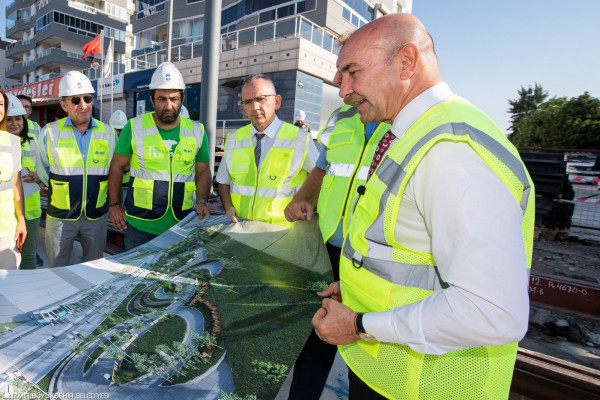 İzmir Büyükşehir Belediyesi’nin raylı sistem çalışmaları sürüyor. Yüzde 76’sı tamamlanan Çiğli Tramvayı hattında incelemelerde bulunan İzmir Büyükşehir Belediye Başkanı Tunç Soyer, projede çalışan işçilerin Kurban Bayramı’nı da kutladı.
