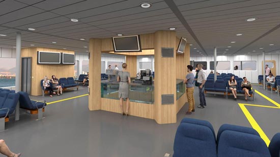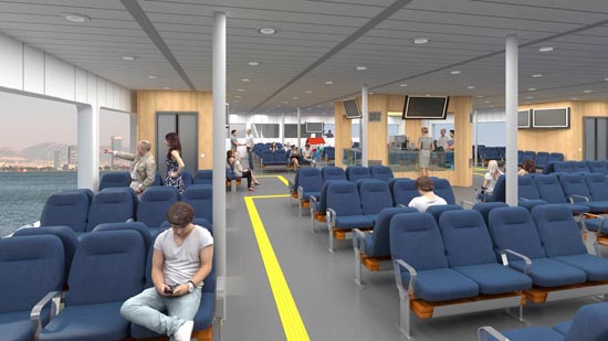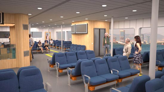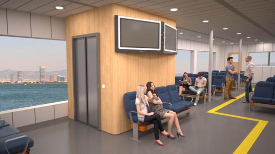 Çalışma hakkında bilgi veren İEÜ Yat Tasarımı Yüksek Lisans Programı Anabilim Dalı Başkanı Yrd. Doç. Dr. Emre Ergül, feribotun iç mekân malzeme ve görselleştirme çalışmalarını gerçekleştirdiklerini belirterek, “Malzeme seçimimizdeki temel yaklaşım, yolcunun körfez manzarasını neredeyse kesintisiz bir biçimde algılamasını sağlamak oldu. Bunun için iç mekândaki, büfe ve asansörler gibi dikkat çekici odakların açık renkli ve dokusu belirgin olmayan ahşap malzeme ile kaplanmasını tercih ettik. Aynı şekilde tavan ve düşey yüzeyler de iç mekân-dış mekân algısındaki sürekliliğe katkıda bulunuyor. Zemin döşemesi ise elbette yer hissini kaybetmemek için diğer yüzeylere oranla daha koyu olarak belirlendi” dedi.