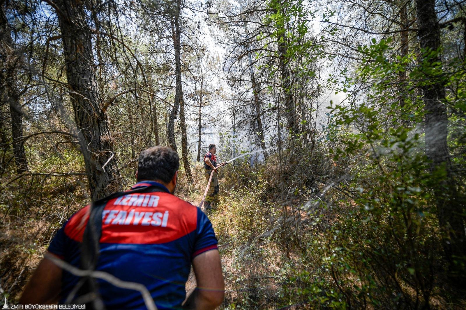İzmir Büyükşehir Belediyesi İtfaiye Dairesi Başkanlığı’na bağlı itfaiye ekipleri, kentin dört bir yanında süren orman yangınlarını kontrol altına almak için İzmir Orman Bölge Müdürlüğü ekiplerine destek veriyor. Aktif olarak 365 personelle vardiyalı olarak yangınlara karşı mücadele eden İzmir Büyükşehir Belediyesi, son olarak Gaziemir Sarnıç bölgesi ile Buca Kaynaklar’da başlayan, yoğun bir mücadelenin ardından kontrol altına alınan orman yangınlarının yeniden yaşanmaması için nöbette. Soğutma işlemlerinin sürdüğü bölgelerde görevli ekipler, belediyenin köy muhtarlarına dağıttığı tankerlerden de faydalanıyor.