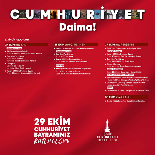 İzmir Büyükşehir Belediyesi 29 Ekim programını açıkladı. Coşku dolu program 27 Ekim Salı günü tiyatro oyunlarıyla başlayacak ve 30 Ekim Cuma’ya kadar devam edecek.