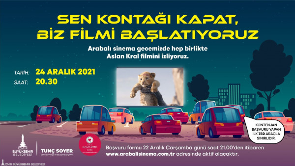 İzmir Büyükşehir Belediyesi, 1950’li yıllarda Amerika’da ortaya çıkan ve sonrasında tüm dünyada yaygınlaşan Arabalı Sinema (Drive-in Movie) etkinliğini 24 Aralık Cuma günü İzmirlilerle birlikte yapacak. Yavru bir aslan olan Simba’nın maceralarını konu edinen iki saatlik “Aslan Kral” filmi 20.30’da başlayacak. Sinemaseverler, arabalarından inmeden sinema keyfi yaşayacak. İzmirliler İnciraltı Demokrasi Meydanı, Gaziemir Fuar İzmir, Buca Eski Pazar Yeri, Çiğli Egekent Parkı yanı, Bornova Aşık Veysel Rekreasyon Alanı Havuz İzmir yanı, Mavişehir İZBAN Durağı karşısı olmak üzere altı noktada etkinliğe katılabilecek.