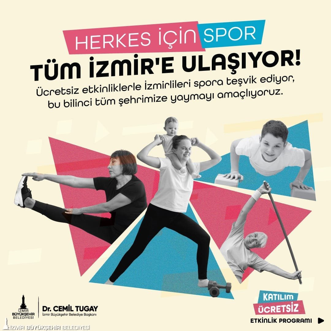 İzmir Büyükşehir Belediyesi, toplumun tüm kesimlerinin spor olanaklarına rahatlıkla ulaşabilmesi için haftanın her günü ücretsiz spor faaliyetleri düzenliyor. Türkiye Sağlıklı Kentler Birliği Başkanı ve İzmir Büyükşehir Belediye Başkanı Dr. Cemil Tugay’ın “Spor Kenti İzmir” hedefi doğrultusunda bir yandan amatör spor kulüplerine nakdi destek ve malzeme yardımı yapılırken, bir yandan da tesis yatırımları sürüyor. Buca, Bornova, Gaziemir, Karşıyaka ve Menderes’te 21 bin metrekare büyüklüğünde 3 Uluslararası Futbol Federasyonu onaylı futbol sahası, 4 halı saha ve 1 ilçe atletizm parkuru için 16 milyon TL yatırım yaparak yenileme çalışmasını tamamlayan Büyükşehir, “Herkes İçin Spor” başlığı altında ücretsiz spor etkinlikleri de yapıyor. Farklı spor salonlarında uzman eğitmenler tarafından hazırlanan programlarda kalp sağlığını iyileştiren, kas iskelet sistemi ve eklem sağlığını güçlendiren, genel sağlığı artıracak egzersizler yapılıyor. Programlara katılmak isteyenlerin, yararlanmak istediği tesiste yüz yüze kayıt yaptırması gerekiyor.