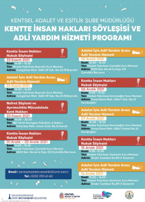 6 Aralık-7 Aralık tarihlerinde 11.00’de Meslek Fabrikası Karabağlar Kurs Merkezi’nde “Kentte İnsan Hakları” söyleşisi var. 10.00-16.00 saatleri arasında ise adli yardım hizmeti olacak.