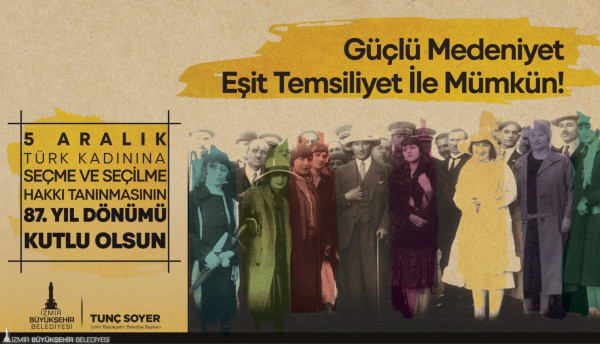 İzmir Büyükşehir Belediye Başkanı Tunç Soyer’in eşitlikçi politikaları ve “kadın dostu kent” vizyonu doğrultusunda 5 Aralık Pazar günü Türk kadınına seçme ve seçilme hakkı verilişinin 87’inci yılı İzmir’de bir dizi etkinlikle kutlanacak. Toplumsal cinsiyet rollerinden kaynaklanan kadın-erkek eşitsizliğiyle ilgili farkındalık oluşturmak amacıyla düzenlenen program kapsamında kadın milletvekilleri, belediye başkanları, meclis üyeleri, muhtarlar, siyasi partiler, kadın dernekleri, demokratik kitle örgütleri ve meslek odaları temsilcileri 12.30’da Kültürpark Lozan kapısında buluşarak Cumhuriyet Meydanı’na doğru yapılacak yürüyüşte bir araya gelecek. “Temsilde Eşitlik İçin Yürüyoruz” sloganıyla yapılacak yürüyüşün ardından İzmir Büyükşehir Belediye Başkanı Tunç Soyer ile İzmir Büyükşehir Belediyesi Toplumsal Cinsiyet Eşitliği Komisyonu Başkanı ve CHP Grup Başkanvekili Nilay Kökkılınç bu önemli güne dair düşüncelerini katılımcılarla paylaşacak. Atatürk Anıtı’na çelenk koyulmasının ardından 13.45-15.45 saatleri arasında Yeşilyurt’taki Mustafa Necati Kültür Merkezi’nde Ürkmez Tiyatrosu’nun “Kadınların Dünyası” adlı oyunu sahnelenecek. 20.00’de ise Ahmed Adnan Saygun Sanat Merkezi’nde “El Ele Senfoni Müzik” etkinliği İzmirliler ile buluşacak.