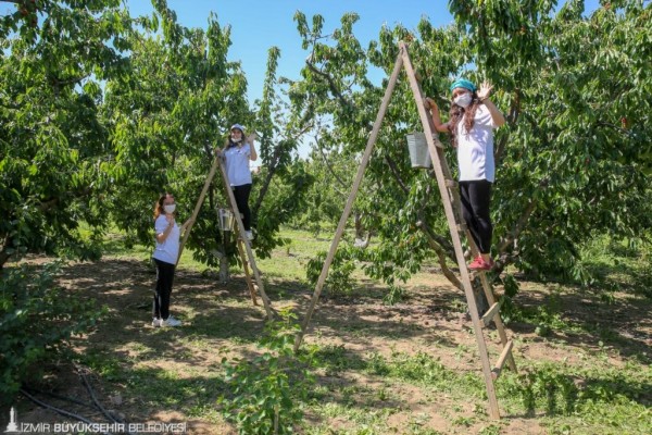 İzmir Büyükşehir Belediyesi, “Üreticinin Ürünü Dalında Kalmasın” diyerek geçen yıl başlattığı hasat dayanışmasını bu yıl da sürdürüyor. Büyükşehir, Kemalpaşa’da talepte bulunan 101 kiraz üreticisine gönüllü işgücü desteği sağlayacak ve 25 köyde eş zamanlı olarak bu destek programını yürütecek. Büyükşehir’in gönüllü meyve hasadı programına başvuran 18-45 yaş arasında 212 tarım gönüllüsünden bugün ilk grup Tarihi Havagazı Fabrikası Gençlik Yerleşkesi’nden Kemalpaşa’daki kiraz bahçelerine doğru yola çıktı. Pandemi önlemleri alınarak oluşturulan gönüllü hasat programı Haziran ayı sonuna kadar devam edecek. Büyükşehir tarım gönüllüleri ve kiraz üreticilerine hasat dönemi boyunca zirai mühendislik desteği de sağlayacak.