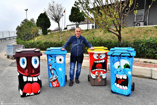 Park ve Bahçeler Dairesi Başkanlığı’nda boyacı olarak çalışan Murat Ülkü’nün çizgi film karekterlerinden esinlenerek sanat eserine dönüştürdüğü çöp kutuları, başta çocuklar olmak üzere İzmirliler tarafından da beğeni topladı.
