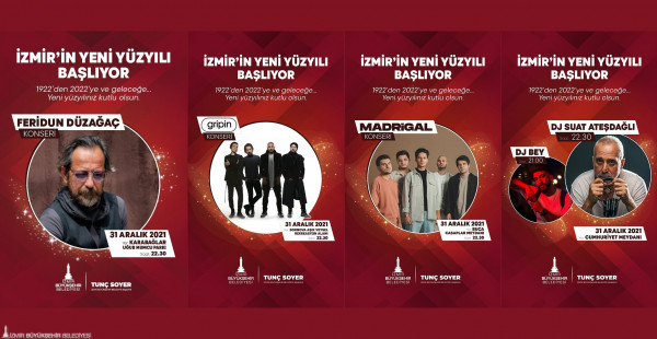 “İzmir’in yeni yüzyılı başlıyor” sloganıyla yeni yıl coşkusunu kentin her köşesine yaymayı amaçlayan İzmir Büyükşehir Belediyesi, 31 Aralık Cuma gecesi usta müzisyenleri ağırlayacak. Cumhuriyet Meydanı’nda 21.00’de “DJ Bey”in performansının ardından 22.30’da 1983’ten bu yana DJ kabininde olan Suat Ateşdağlı sahne alacak. Alternatif rock grubu “Madrigal” ise Buca Kasaplar Meydanı’nda 22.30’da İzmirliler ile buluşacak. Bornova Âşık Veysel Rekreasyon Alanı’nda yine 22.30’da “Gripin”, Karabağlar Uğur Mumcu Parkı’nda ise Feridun Düzağaç konseri var. Yılbaşı eğlencesi video mapping gösterileriyle renklenecek.