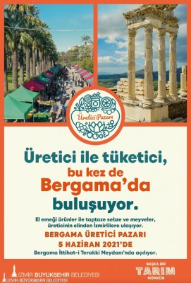İzmir Büyükşehir Belediye Başkanı Tunç Soyer’in kırsaldaki yerel üreticiyi desteklemek ve kentliyi güvenilir, sağlıklı ve ucuz gıdayla buluşturma hedefi doğrultusunda Kadifekale, Kültürpark ve Buca’da hayata geçirdiği yerel üretici pazarlarının dördüncüsü 5 Haziran’da Bergama’da açılıyor. Bergama İttihat-i Terakki Meydanı’nda kurulacak yerel üretici pazarında tarımsal kalkınma kooperatifleri, kadın girişimi kooperatifleri ve kadın üreticilerden oluşan toplam 109 üretici doğal ve taze köy ürünlerini ziyaretçilerine sunacak. Turistik ve hediyelik eşya, el işi yöresel dokuma ürünler, mevsimlik meyve ve sebze, zeytinyağı, kozalak reçeli, kozak pekmezi, yayla balı, çam fıstığı helvası, Tiyelti ekmeği, nohutlu börek ve gözleme çeşitleri gibi zengin ve yöresel ürün çeşitliliğinin olacağı üretici pazarı Cumartesi günleri kurulacak.