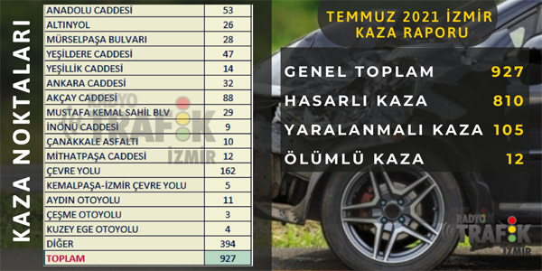 Radyo Trafik İzmir, yaklaşık 3 yıldır İzmir trafiğinin nabzını tutuyor. Haber merkezimize ulaşan bilgilere göre, İzmir’de ana yollarda Temmuz ayı içerisinde 927 trafik kazası meydana geldi. Bu kazalardan 810’u hasarlı, 105’i yaralanmalıydı. 12 kaza ise ölümlü olarak kayıtlara geçti.