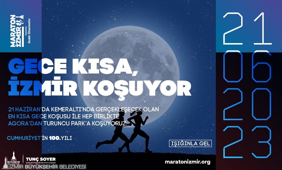 İzmir Büyükşehir Belediyesi, 21 Haziran’da “En Kısa Gece Eğlence Koşusu” düzenliyor. Koşu bu yıl Smyrna Agorası’ndan başlayacak ve Konak Turuncu Bahçe’de sona erecek.