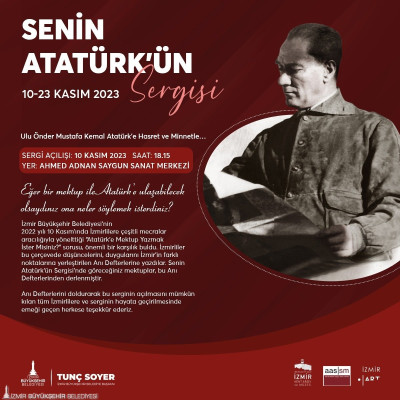 İzmir Büyükşehir Belediyesi, 2022 yılında düzenlediği “Atatürk’e Mektup Yazmak İster Misiniz?” etkinliğine katılan İzmirlilerin yazdığı mektupları “Senin Atatürk’ün Sergisi”nde bir araya getirdi. Ahmed Adnan Saygun Sanat Merkezi’nde 10 Kasım Cuma günü açılacak sergi, 23 Kasım’a kadar sürecek.